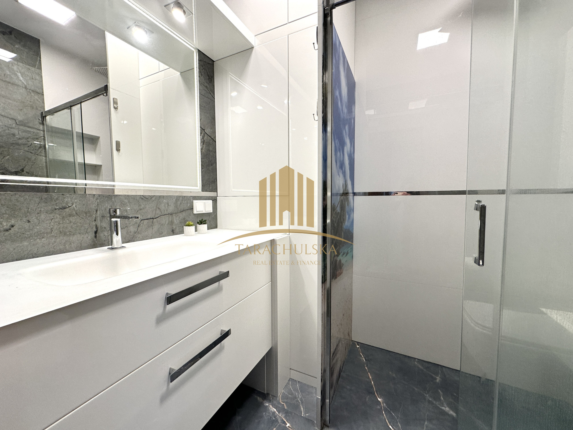– a bathroom with a double shower cabin and numerous cabinets