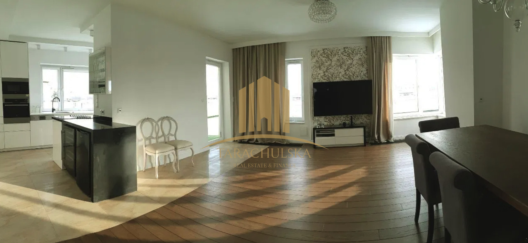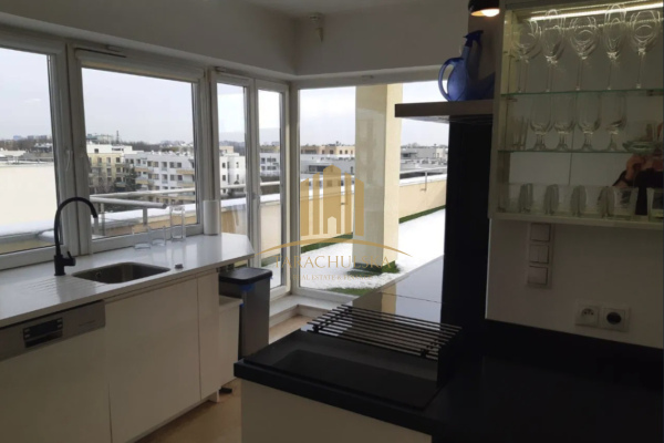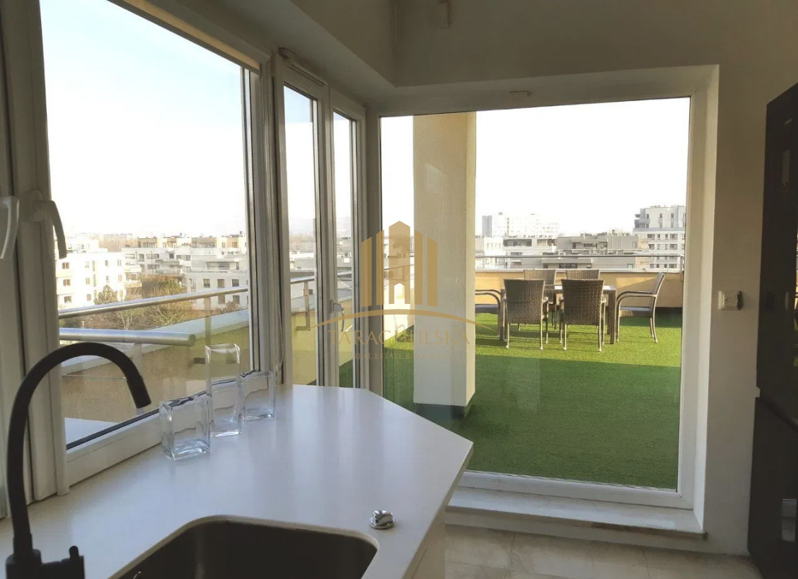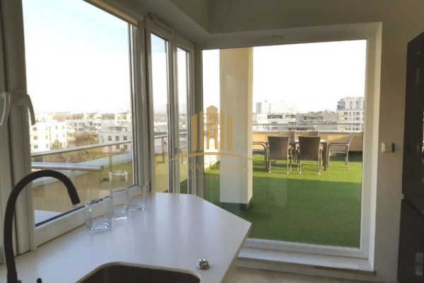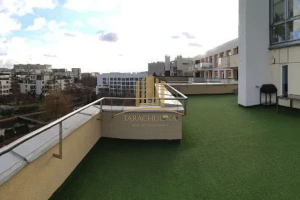 Prezentujemy Państwu do wynajęcia apartament z ogromnym ponad 130m2 tarasem z piękną, niczym nieograniczoną panoramą. Apartament zlokalizowany jest w najbardziej atrakcyjnym fragmencie strzeżonego osiedla Marina Mokotów.
